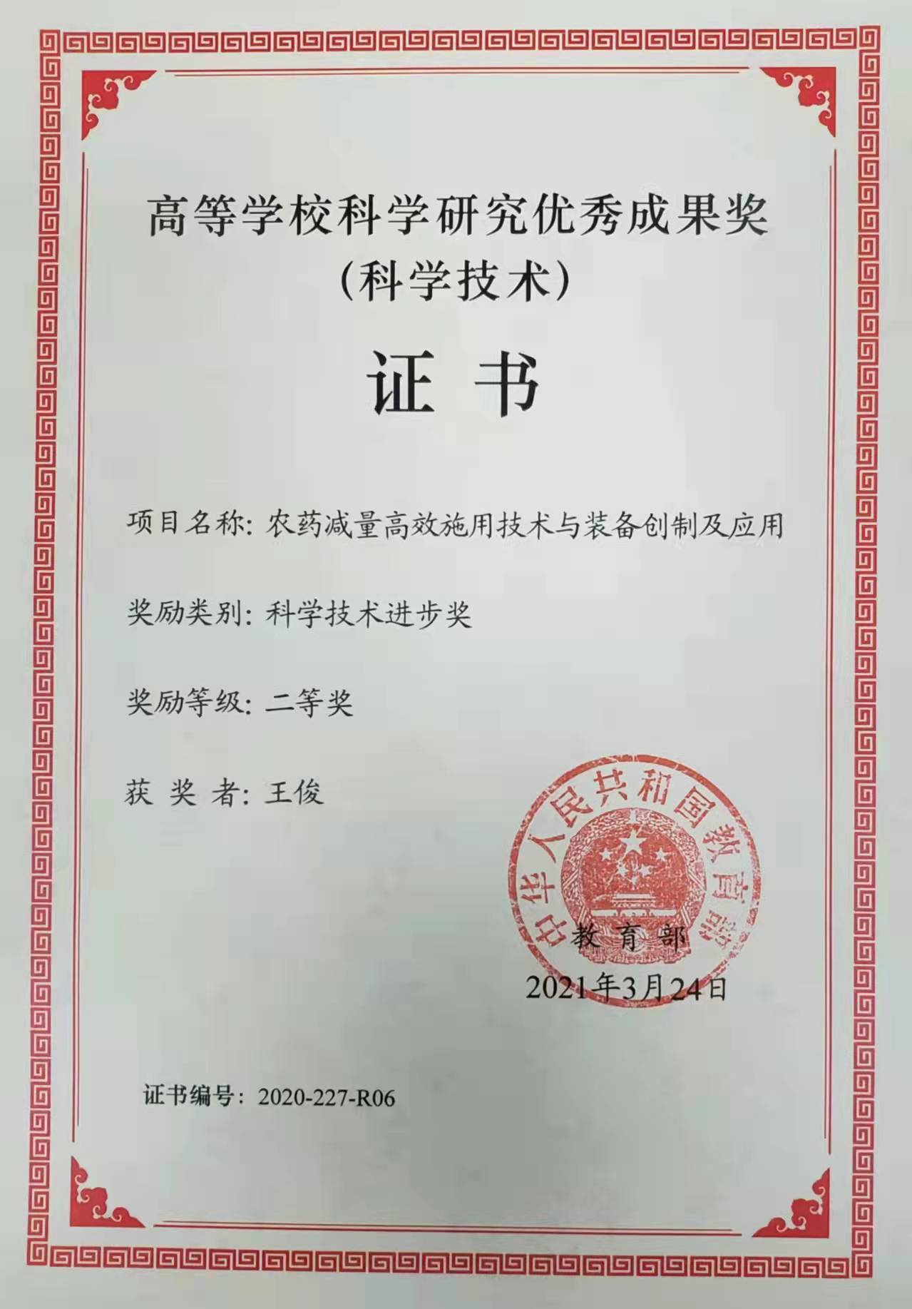 中農豐茂植保機械有限公司與中國農業大學合作項目“農藥減量高效施用技術與裝備創制及應用”與2021年3月榮獲高等學校科學研究優秀成果獎(科學技術)二等獎,公司研發部王俊作爲項目主要參加人員一起獲獎。我公司在自走式高地隙噴杆噴霧機系列産品的研制、生産、銷售和推廣應用中作用顯著,并參與開展了自走式植保機械标準化作業試驗示範,協助構建了農藥減量高效施用技術新體系。